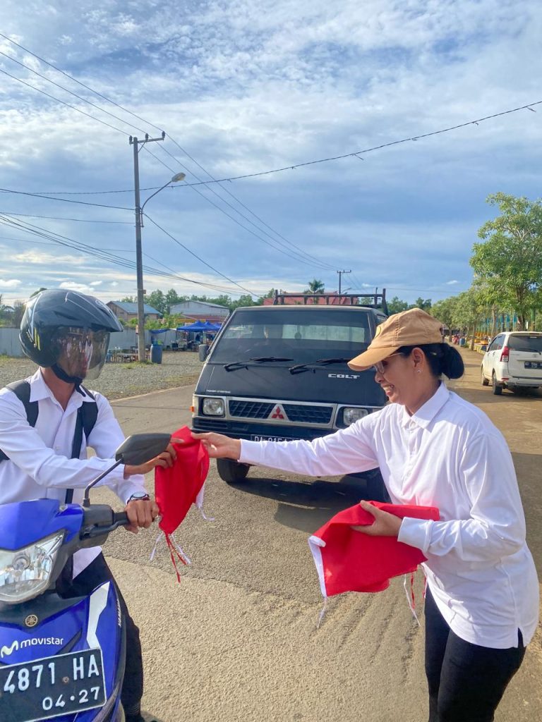 TANA TIDUNG – Menjelang Hari Ulang Tahun ke-80 Republik Indonesia, Pemberdayaan Kesejahteraan Keluarga (PKK) Kabupaten Tana Tidung membagikan bendera Merah Putih kepada masyarakat pengguna jalan di Ruang Terbuka Hijau (RTH) H. Joesoef Abdullah, Tideng Pale, Kecamatan Sesayap, Minggu (10/8).